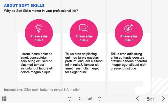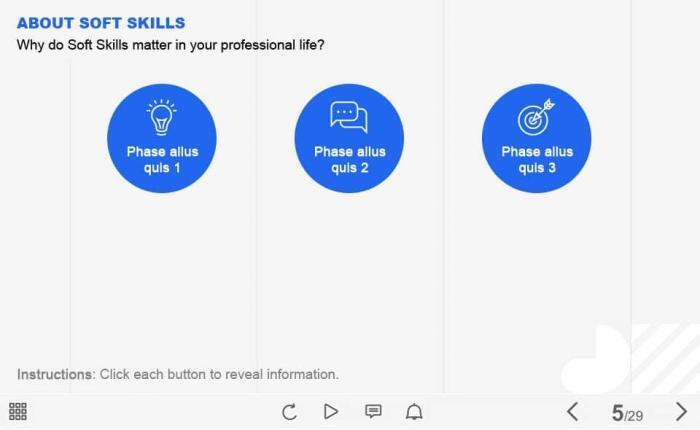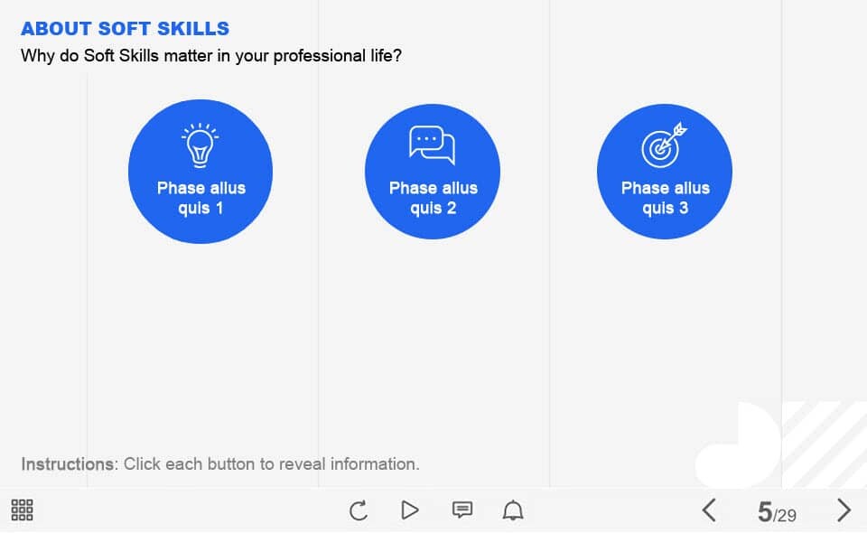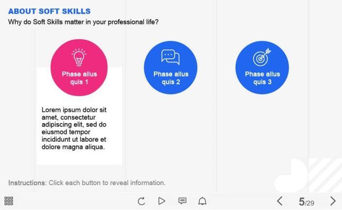 Three Round Buttons — Captivate Template. The unique eLearning interaction is designed with Captivate 2019. The template contains 3 round buttons with icons. The user must click each of them to reveal the additional materials. The template is a ready-made product: all you need is to insert it into the projects and fill with own training content. It’s recommended to launch it on the devices with the screen size more than 7 inches.