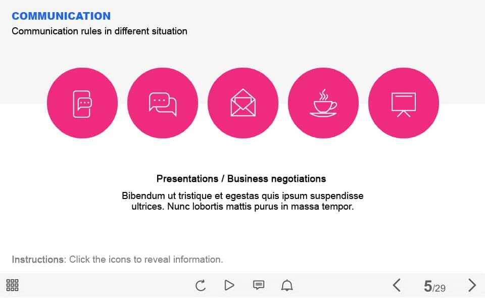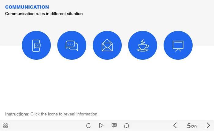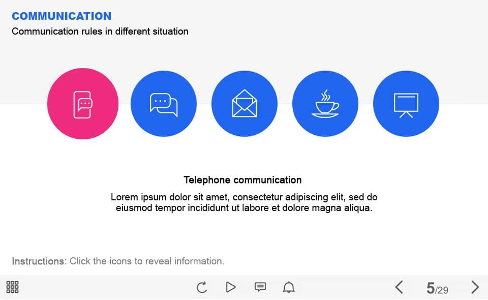Communication Icons — Captivate Template. The unique eLearning interaction is designed with Captivate 2019. The template contains 5 round icons. The user must click each of them to reveal the additional materials. The template is a ready-made product: all you need is to insert it into the projects and fill with own training content. It’s recommended to launch it on the devices with the screen size more than 7 inches.