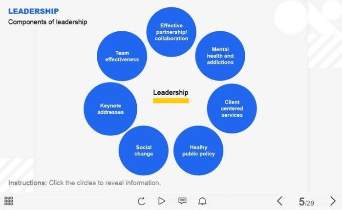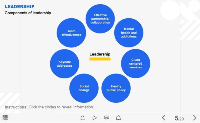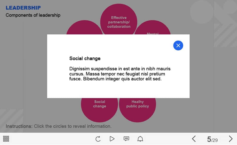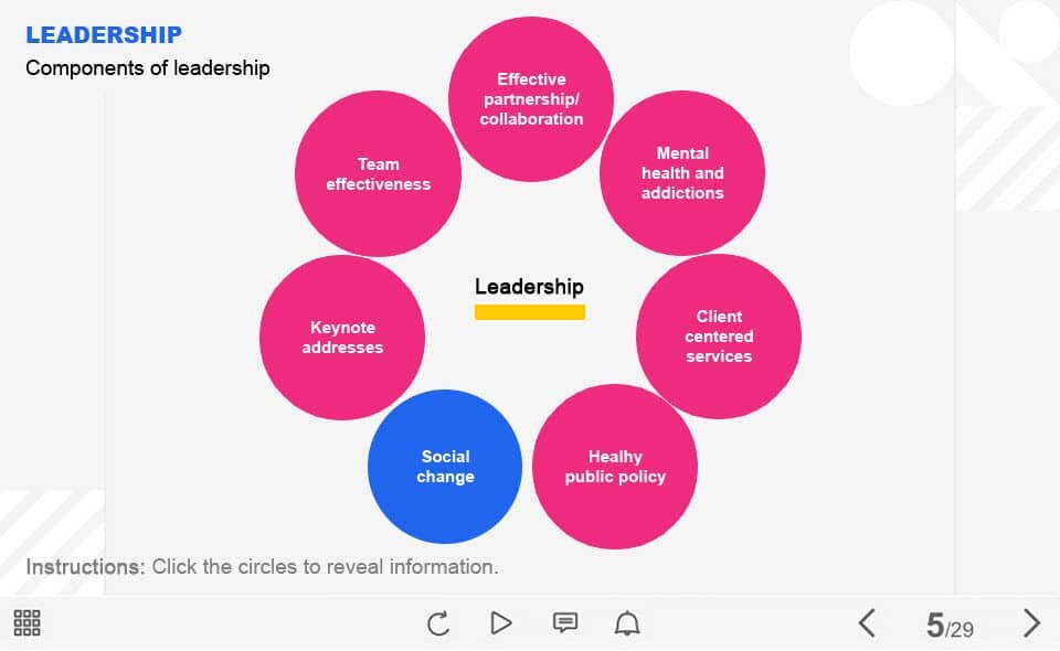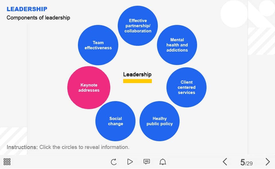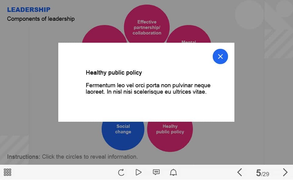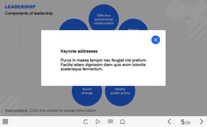 Components of Leadership — Captivate Template. The unique eLearning interaction is designed with Captivate 2019. The template contains 7 round buttons. The user must click each of them to reveal the additional materials in pop-ups. The template is a ready-made product: all you need is to insert it into the projects and fill with own training content. It’s recommended to launch it on the devices with the screen size more than 7 inches.