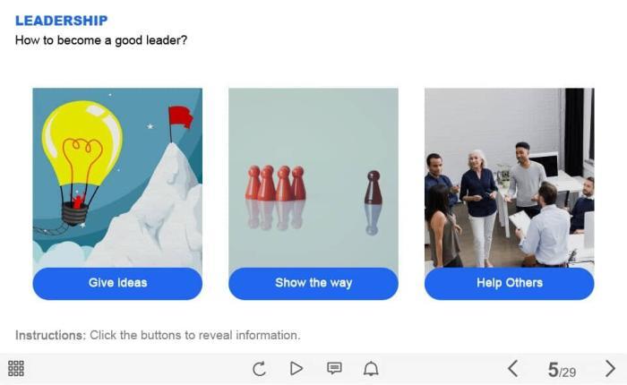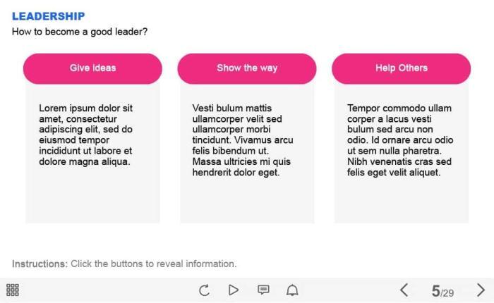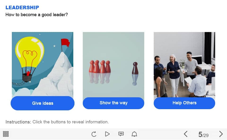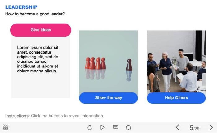 Leadership Skills — Captivate Template. The unique eLearning interaction is designed with Captivate 2019. The template contains 3 buttons. The user must click each of them to reveal the additional materials. The template is a ready-made product: all you need is to insert it into the projects and fill with own training content. It’s recommended to launch it on the devices with the screen size more than 7 inches.