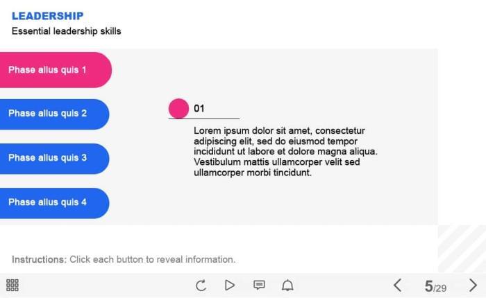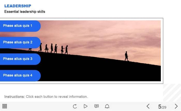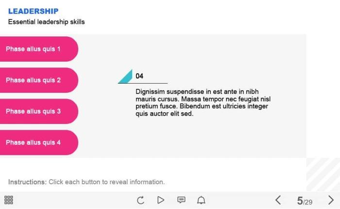 Leadership Tabs — Captivate Template. The unique eLearning interaction is designed with Captivate 2019. The template contains 4 tabs arranged at the left part of the screen. The user must click each of them to reveal the additional materials. The template is a ready-made product: all you need is to insert it into the projects and fill with own training content. It’s recommended to launch it on the devices with the screen size more than 7 inches.
