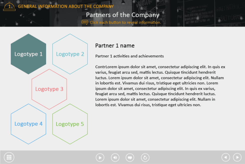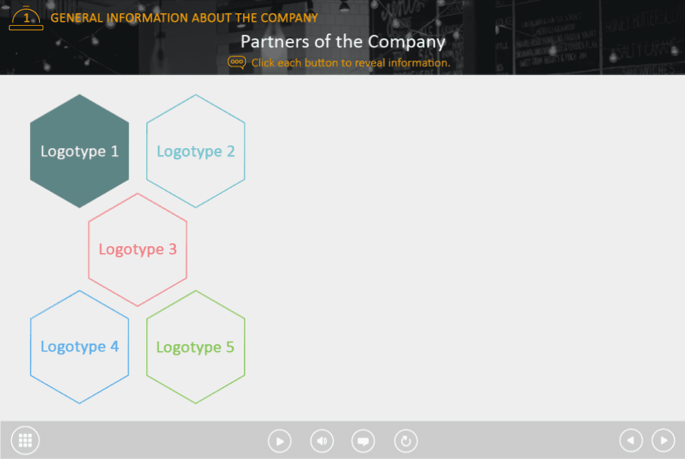 Captivate Five Hexagonal Buttons Template. The ready-made interactive slide would be a great helper for creating powerful training courses. It contains 5 clickable buttons designed in the form of hexagons. The user must click on each button to reveal the learning materials on the same slide. The template is already designed and prepared for usage.