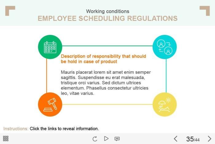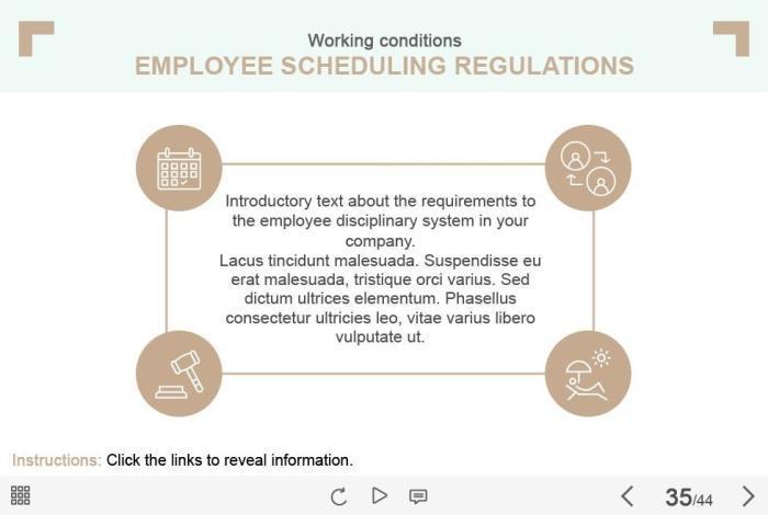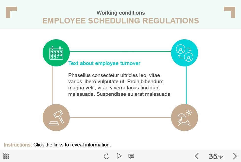 Clickable Round Icons — Captivate Template. The template contains four clickable buttons placed on the corners of a text block. The user must click on each of them to reveal the additional information. This Adobe Captivate interaction slide is a part of the Travel Industry Welcome Course Starter Template. It can be used for creating any type of eLearning courses with Captivate 9 and higher versions. The template is a ready-made product that works well in PCs, laptops and tablets with screen size larger than 7 inches. Feel free to browse through our ready-made e-Learning templates library and pick any ones to create own visual stories.