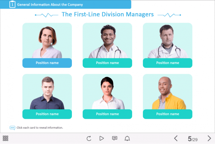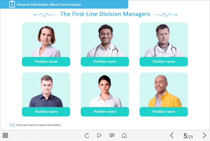 Personnel Presentation — Captivate Template. This ready-made interactive slide would be a great choice for creating e-courses on medical and healthcare themes. It contains 6 clickable cutout photos invented to reveal the additional information in pop-ups. The template is based on Adobe Captivate 9 software. We’ve collected lots of Captivate Templates which that correspond needs of different industries. Now it’s even easier to create an e-learning course from scratch: just select the course template you like and fill it with any number of powerful and attractive interactions!
