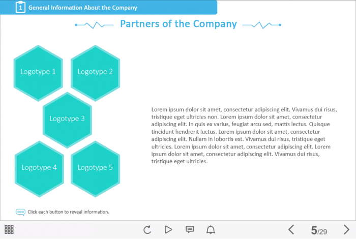 Captivate Five Hexagonal Tabs Template. This ready-made interactive slide would be a great choice for creating e-courses on medical and healthcare themes. It contains five clickable objects designed in the form of hexagons. The user must click on each button to reveal the course information on the right part of the screen. The template is based on Adobe Captivate 9 software. We’ve collected lots of Captivate Templates that correspond to needs of different industries. Now it’s even easier to create an e-learning course from scratch: just select the course template you like and fill it with any number of powerful and attractive interactions!