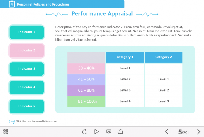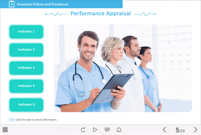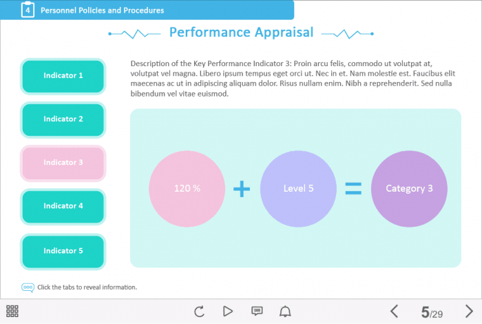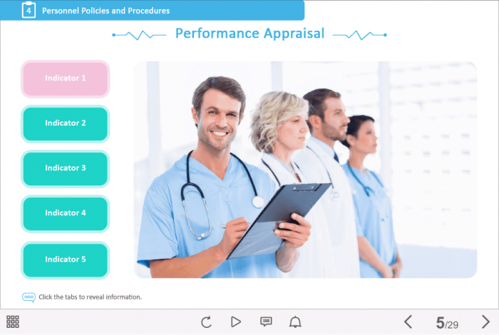 Captivate Five Vertical Tabs Template. This ready-made interactive slide would be a great choice for creating e-courses on medical and healthcare themes. It contains 5 tabs placed at the left part of the screen. The template is based on Adobe Captivate 9 software. We’ve collected lots of Captivate Templates that correspond to needs of different industries. Now it’s even easier to create an e-learning course from scratch: just select the course template you like and fill it with any number of powerful and attractive interactions!