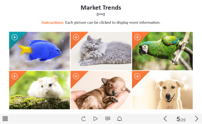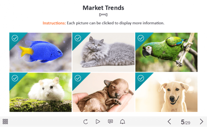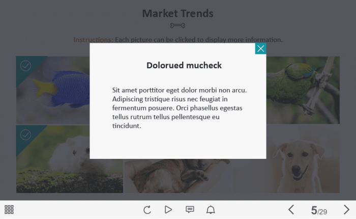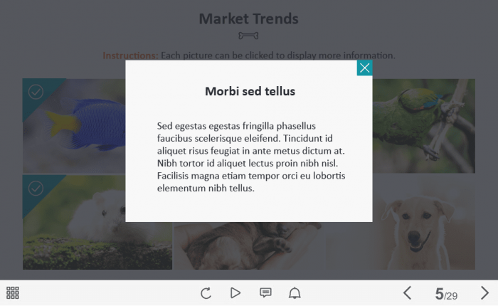 Grid Images — Captivate Template. The unique eLearning interaction is designed with Captivate 2019 software. The template contains 6 clickable images. The user must click on each image to reveal the additional materials in pop-ups. The interactive slide is a ready-made product: all you need is to insert it into the projects and fill with own training content. We recommend to launch it on the devices with the screen size more than 7 inches. We’ve collected lots of Adobe Captivate templates to speed up the course development and to save you from routine work.