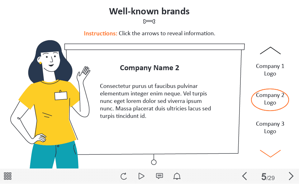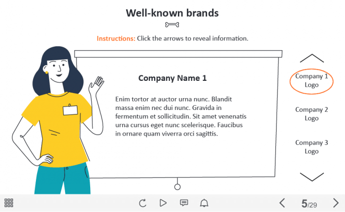 Vertical Slideshow — Captivate Template. The unique eLearning interaction is designed with Captivate 2019 software. The template contains 5 slides with a control panel at the right part of the screen. The user must click on the up and down arrows to switch between the slides. The interactive slide is a ready-made product: all you need is to insert it into the projects and fill with own training content. We recommend to launch it on the devices with the screen size more than 7 inches. We’ve collected lots of Adobe Captivate templates to speed up the course development and to save you from routine work.