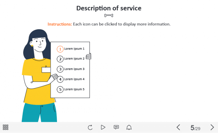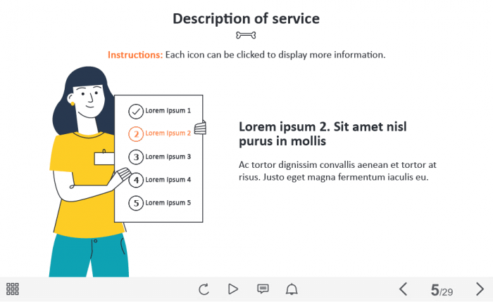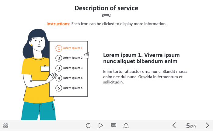 Five Tabs on Board — Captivate Template. The unique eLearning interaction is designed with Captivate 2019 software. The template contains 5 tabs placed on a board. The user must click on each tab to reveal the additional materials. The interactive slide is a ready-made product: all you need is to insert it into the projects and fill with own training content. We recommend to launch it on the devices with the screen size more than 7 inches. We’ve collected lots of Adobe Captivate templates to speed up the course development and to save you from routine work.