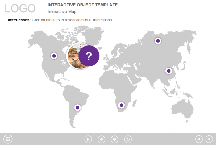 Lectora World Map Template. Lectora Template based on Lectora Publisher 12. Designed for showing any type of information in pop-up windows. Consist of 5 interactive markers, intended to reveal additional info. Perfectly runs on both Tablet and PC. Could be easily added to any type of Lectora Publisher Player Skins to create an effective elearning courses. It’s already designed and prepared for usage.