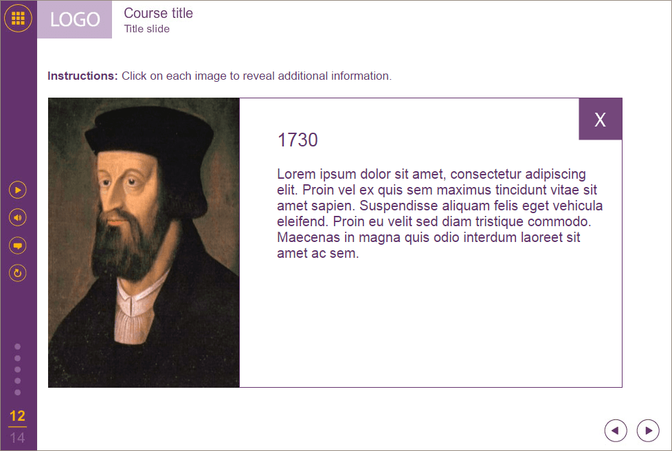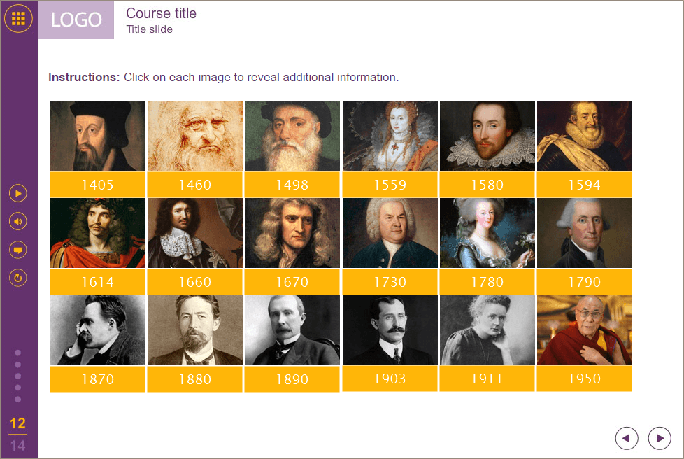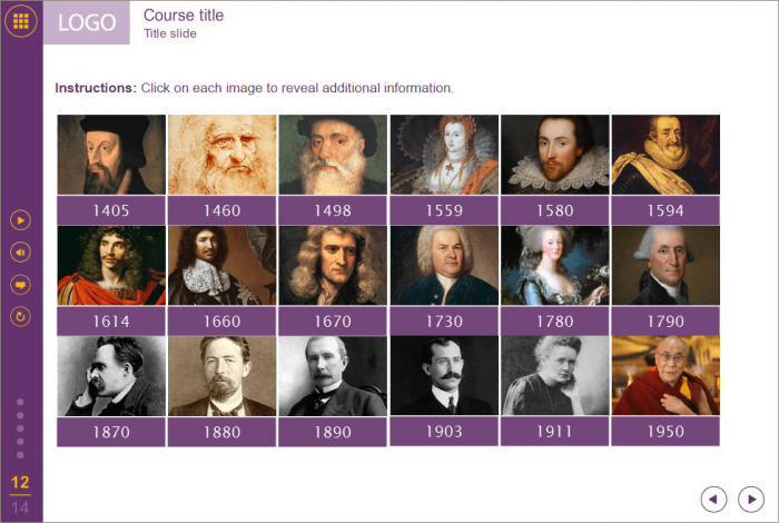 Lectora Historic Figures Template. Lectora Template based on Lectora Publisher 16. Designed for showing any type of information in special frames. Consist of 18 interactive grid cells, intended to reveal additional info. Perfectly runs on both Tablet and PC. Could be easily added to any type of Lectora Publisher Player Skins to create an effective elearning courses. It’s already designed and prepared for usage.