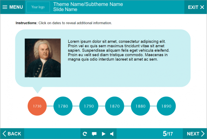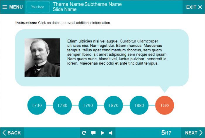 Lectora Timeline Template. Lectora Template based on Lectora Publisher 16 Software. Designed for showing any type of information in special frames. Consist of 6 interactive timeline buttons, intended to reveal additional info. Perfectly runs on both Tablet and PC. Could be easily added to any type of Lectora Publisher Player Skins to create an effective elearning courses. It’s already designed and prepared for usage.