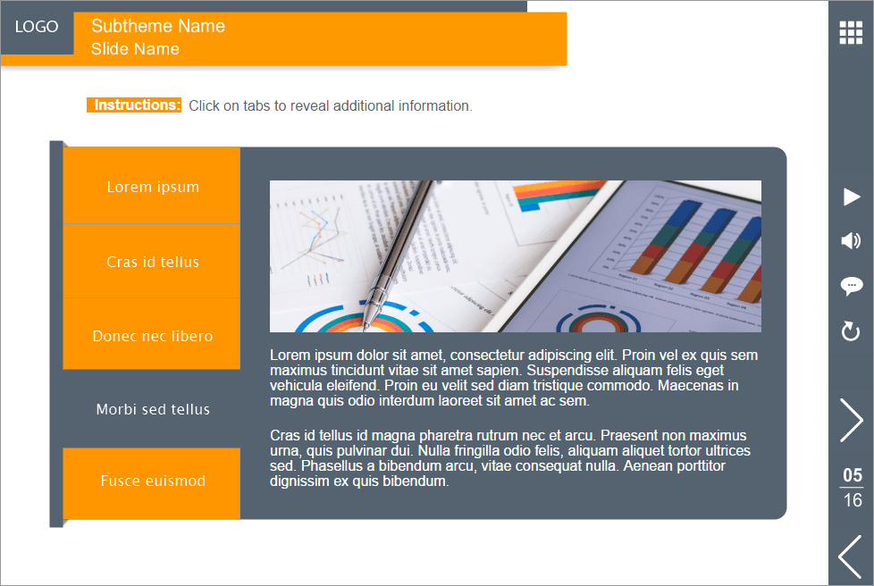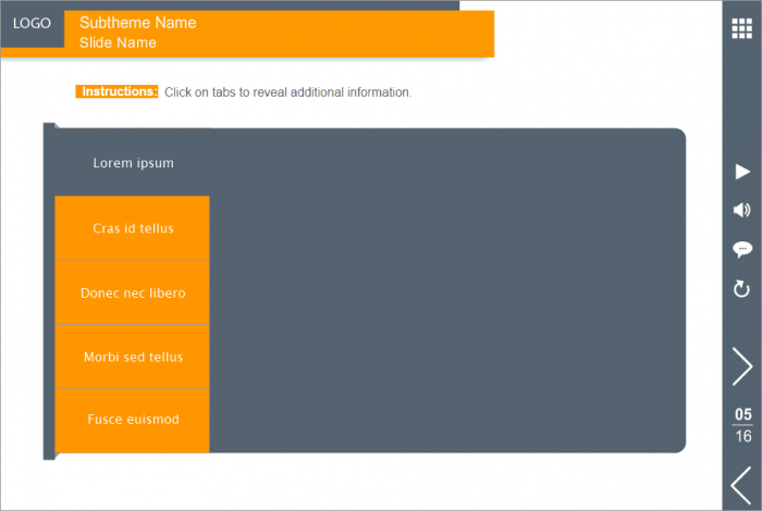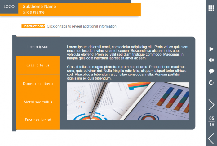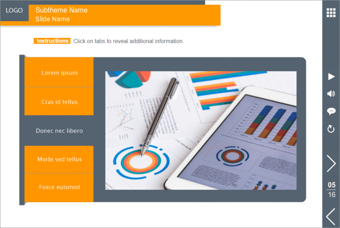 Lectora Vertical Tabs Template With Dark-grey Frame. Lectora Template based on Lectora Publisher 16 software. It represents 5 clickable tabs, which display the additional information. This interaction is compatible with Lectora Publisher Player Skins. It can be used for creating your own effective elearning courses. Interactive slide is a ready-to-use product. Can be launched on PCs and tablets.