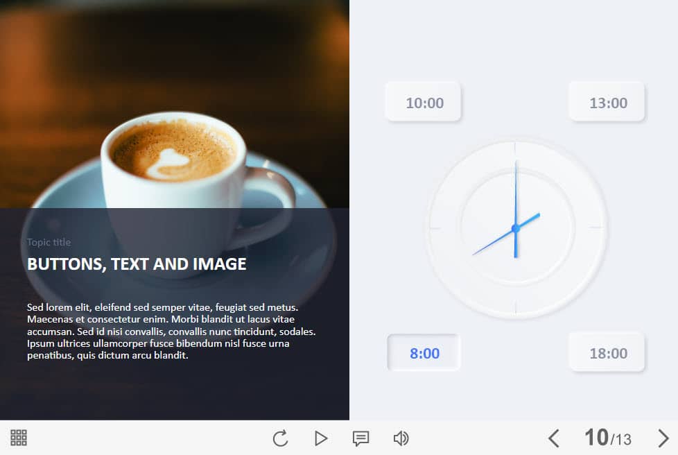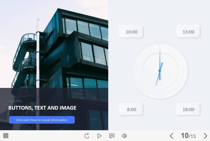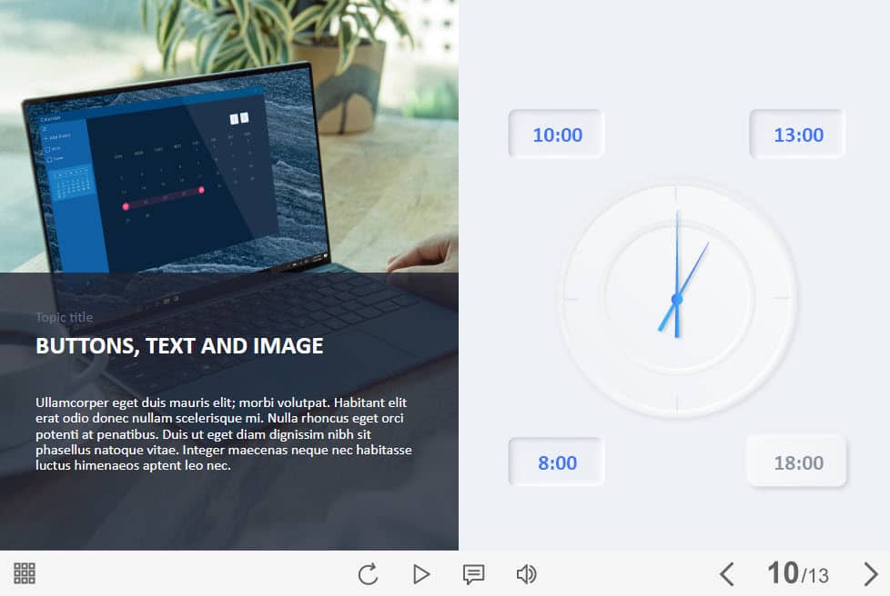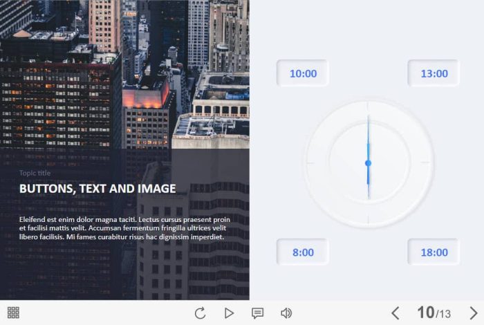 Clickable Time — Lectora Template. The eLearning interaction slide would become a great addition for your eCourse. It contains four clickable objects designed as time clocks. The user must click on each of them to reveal the additional information. The template is compatible with Lectora 18 software. All you need is just to paste the template into your project and to fill it with own learning materials. Try to create better courses with our amazing Trivantis Lectora templates!
