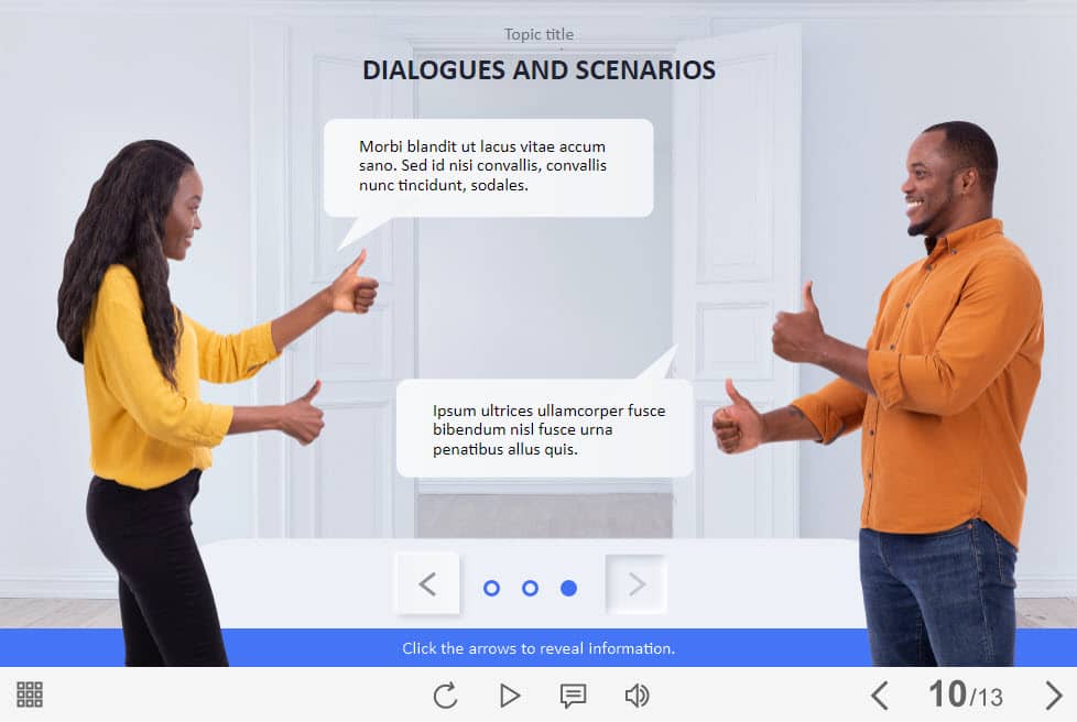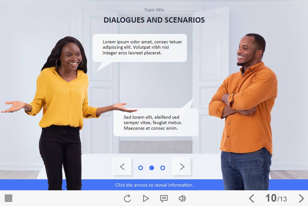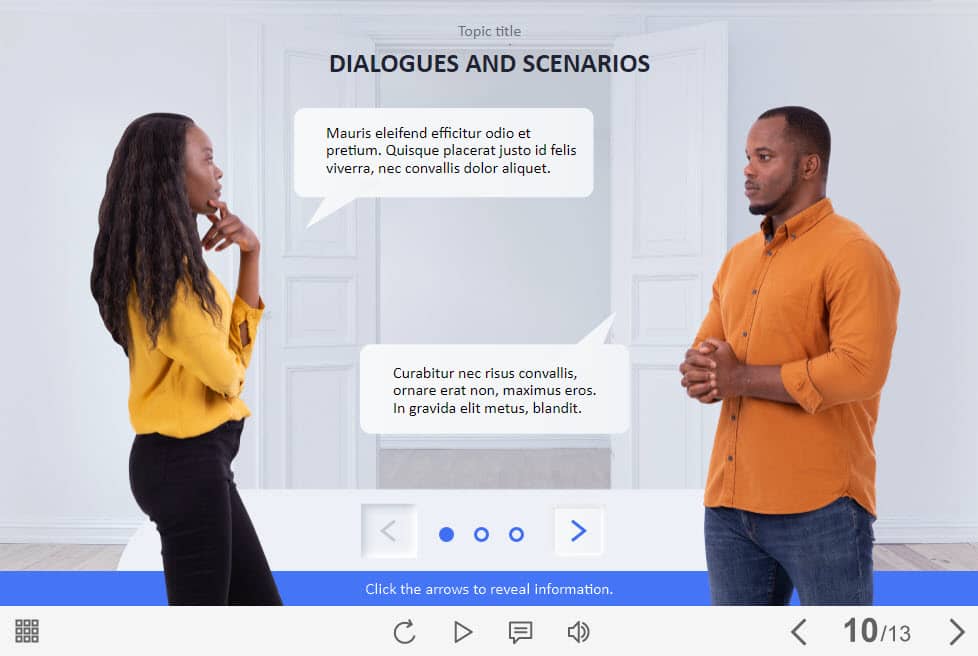 Conversation — Lectora Template. The eLearning interaction slide would become a great addition for your eCourse. It represents a slideshow with three slides that illustrates a conversation between two characters. The user must click on the left and right buttons to reveal the additional information. The template is compatible with Lectora 18 software. All you need is just to paste the template into your project and to fill it with own learning materials. Try to create better courses with our amazing Trivantis Lectora templates!