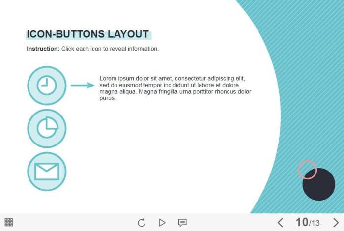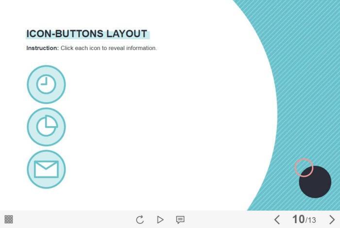Clickable Icons — Lectora Template. The eLearning interaction slide would become a great addition for your eCourse. It contains 3 clickable objects. The user must click on each of them to reveal the additional information. The template is compatible with Lectora 18 and higher. All you need is just to paste the template into your project and to fill it with own learning materials. Try to create better courses with our amazing Trivantis Lectora templates!
