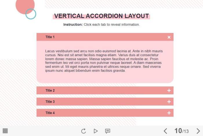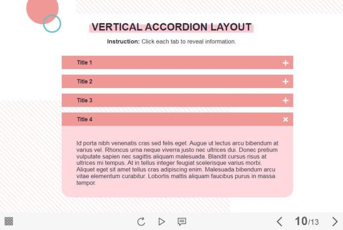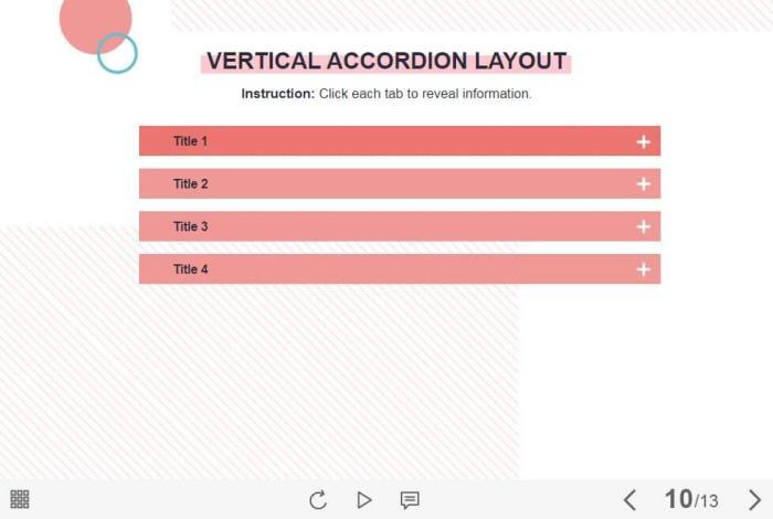 Vertical Accordion — Lectora Template. The eLearning interaction slide would become a great addition for your eCourse. It contains 4 clickable objects. The user must click on each of them to reveal the additional information. The template is compatible with Lectora 18 and higher. All you need is just to paste the template into your project and to fill it with own learning materials. Try to create better courses with our amazing Trivantis Lectora templates!