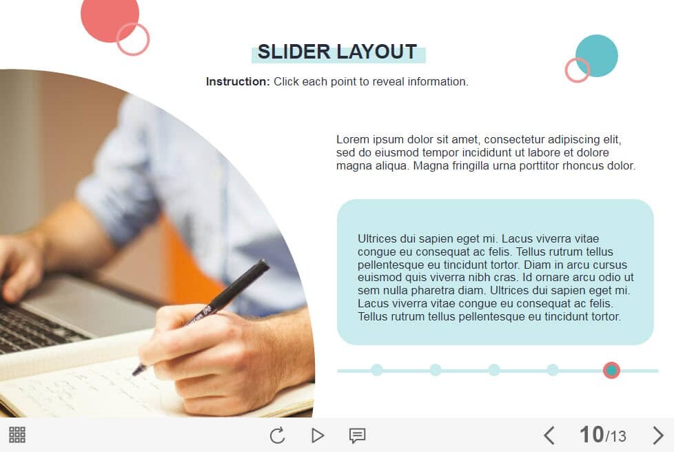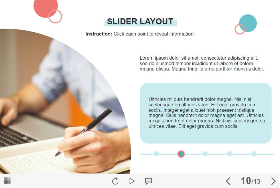 Horizontal Timeline — Lectora Template. The eLearning interaction slide would become a great addition for your eCourse. It contains five clickable points placed on a horizontal timeline. The user must click on each of them to reveal the additional information. The template is compatible with Lectora 18and higher. All you need is just to paste the template into your project and to fill it with own learning materials. Try to create better courses with our amazing Trivantis Lectora templates!