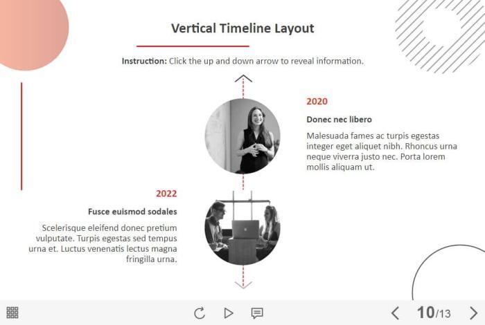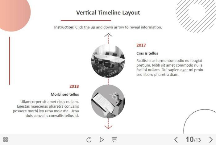 Vertical Timeline — Lectora Template. The eLearning interaction slide would become a great addition for your eCourse. It contains three slides. The user must click on the down and up arrows to switch between the slides and reveal the additional information. The template is compatible with Lectora 18 and higher version. All you need is just to paste the template into your project and to fill it with own learning materials. Try to create better courses with our amazing Trivantis Lectora templates!