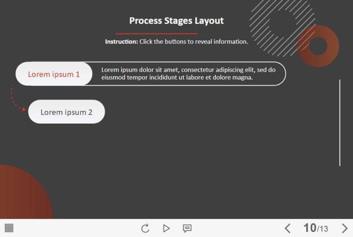 Process Stages — Lectora Template. The eLearning interaction slide would become a great addition for your eCourse. It contains four buttons. The user must click on each of them to reveal the additional information. The template is compatible with Lectora 18 and higher version. All you need is just to paste the template into your project and to fill it with own learning materials. Try to create better courses with our amazing Trivantis Lectora templates!
