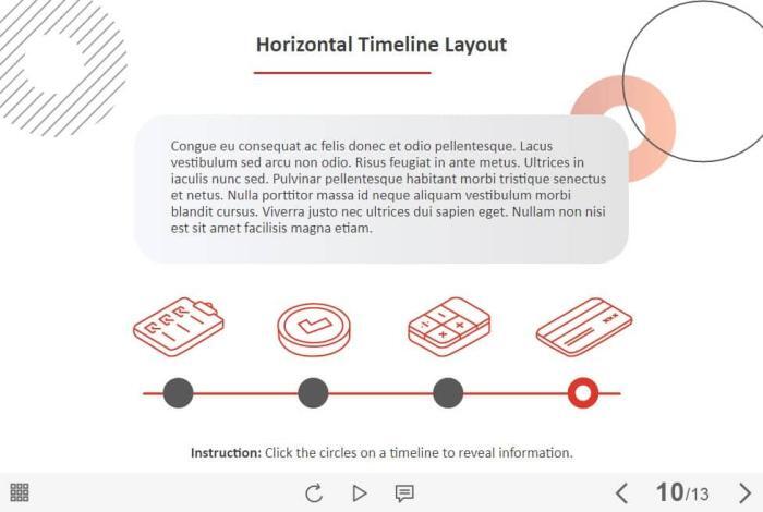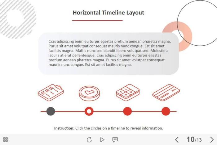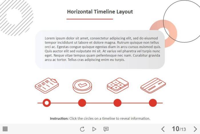 Horizontal Timeline with Icons — Storyline 3 / 360 Template. The eLearning interaction slide would become a great addition for your eCourse. It contains 4 clickable objects. The user must click on each of them to reveal the additional information. The template is compatible with Lectora 18 and higher versions. All you need is just to paste the template into your project and to fill it with own learning materials. Try to create better courses with our amazing Trivantis Lectora templates!