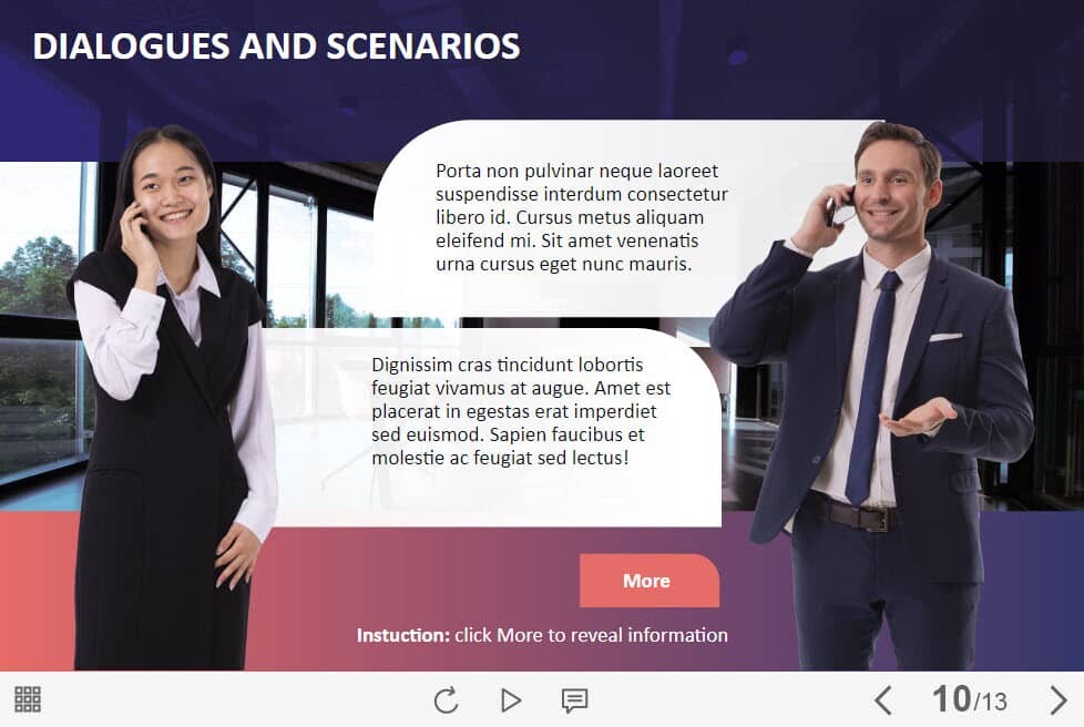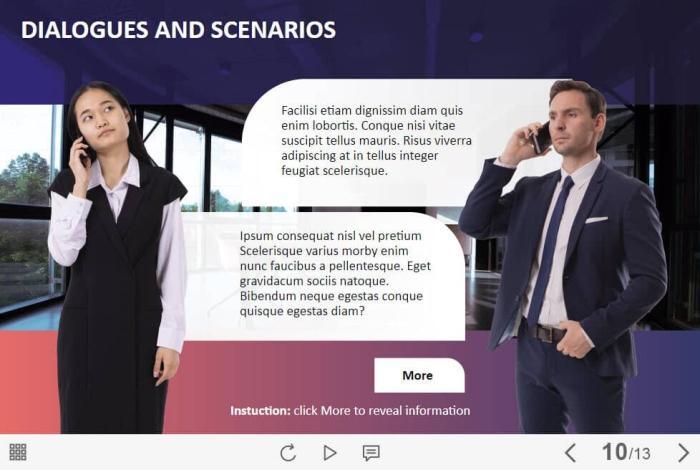 Dialogue — Lectora Template. The eLearning interaction slide would become a great addition for your eCourse. It contains three images with numbers. The user must click on each of them to reveal the additional information. The template is compatible with Lectora 18 software. All you need is just to paste the template into your project and to fill it with own learning materials. Try to create better courses with our amazing Trivantis Lectora templates!