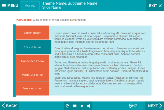 Lectora Bondi Blue Vertical Tabs Template. It includes a vertical unit, which consists of 5 rectangular tabs. An additional information appears when you click on each tab. Lectora Template developed with Lectora Publisher 16 software. It is a ready-to-use product, which is compatible with any Lectora Player Skin you like. You can create an effective elearning course with its help. Interaction perfectly runs on tablet and PC.