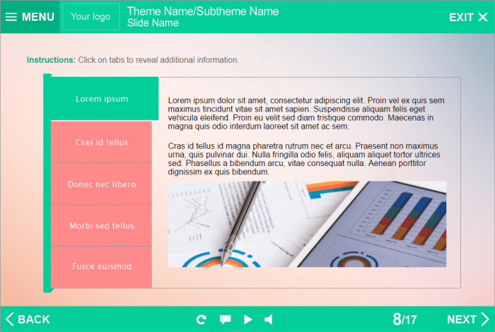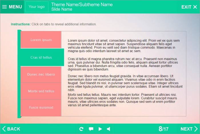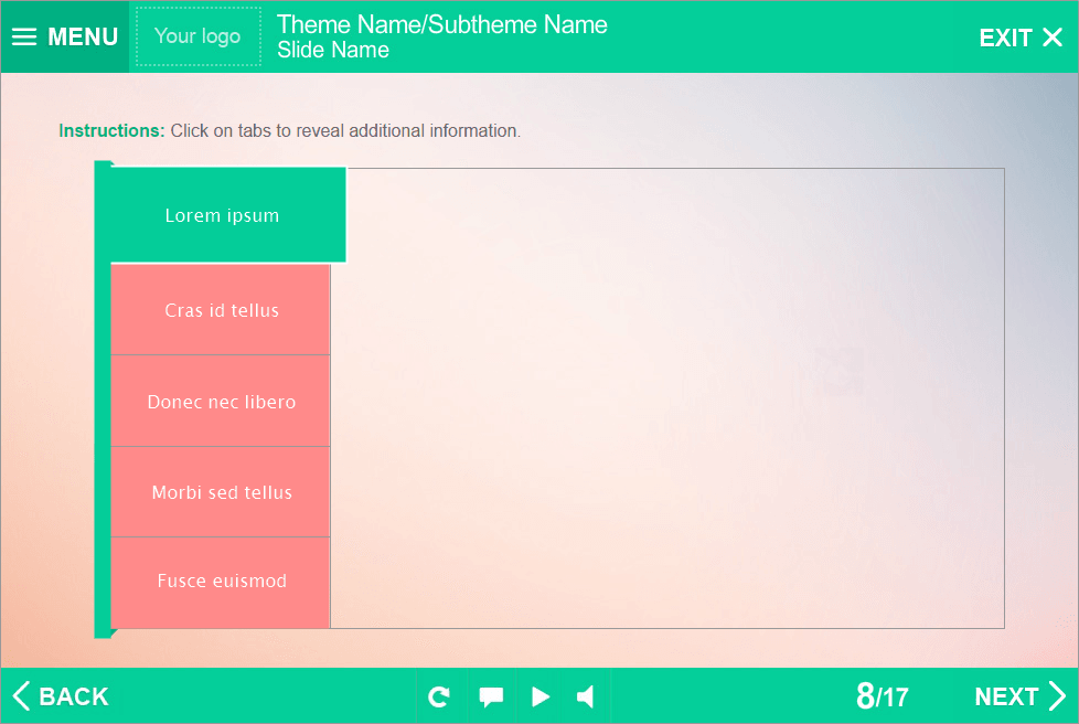 Lectora Green Vertical Tabs Template. It includes a vertical unit, which consists of 5 rectangular tabs. An additional information appears when you click on each tab. Lectora Template developed with Lectora Publisher 16 software. It is a ready-to-use product, which is compatible with any Lectora Player Skin you like. You can create an effective elearning course with its help. Interaction perfectly runs on tablet and PC.