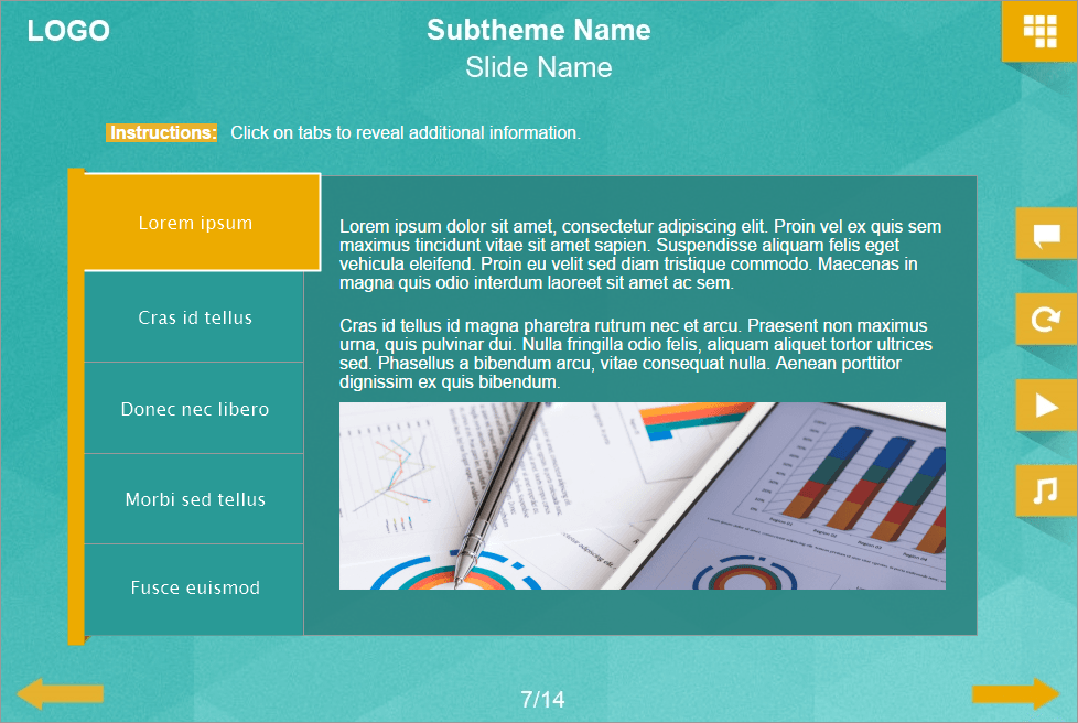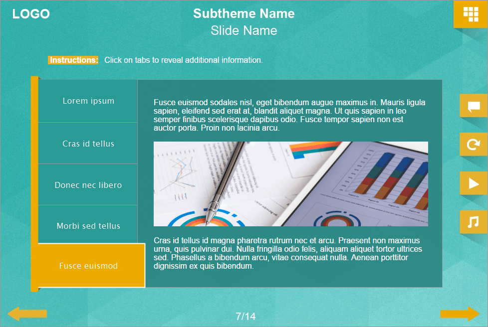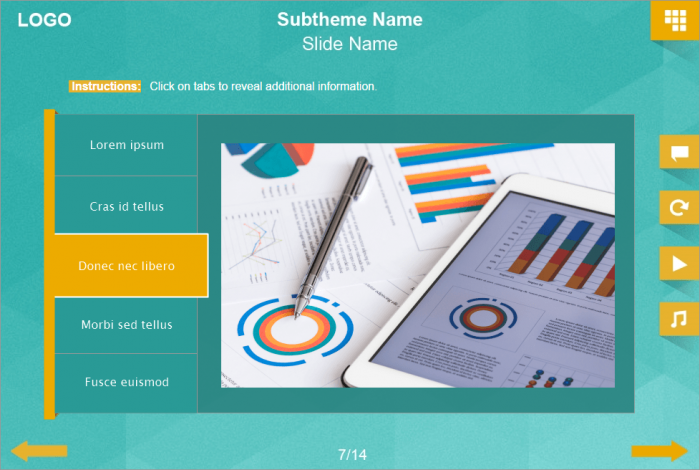 Lectora Vertical Tabs Template With Turquoise Fond. It includes a vertical unit, which consists of 5 rectangular tabs. An additional information appears when you click on each tab. Lectora Template developed with Lectora Publisher 16 software. It is a ready-to-use product, which is compatible with any Lectora Player Skin you like. Interaction perfectly runs on tablet and PC.