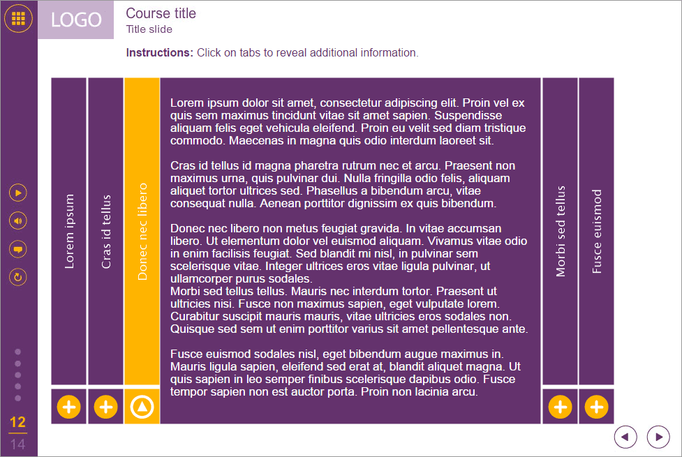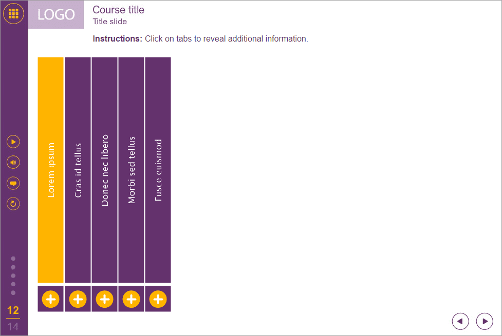 Lectora Purple Accordion Template. It consists of 5 clickable vertical blocks. Each of them contains additional information that displays in a special frame. Lectora Template is a ready-to-use product. It based on Lectora Publisher 16 software and compatible with any Lectora Publisher Player Skin. Perfectly runs on PCs, tablets and mobile devices. It will be an excellent choice for your own elearning project.