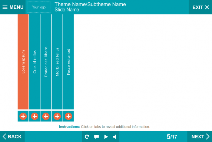 Lectora White Accordion Template With Turquoise Blocks. It consists of 5 clickable vertical blocks. Each of them contains additional information that displays in a special frame. Lectora Template is a ready-to-use product. It based on Lectora Publisher 16 software and compatible with any Lectora Publisher Player Skin. Perfectly runs on PCs, tablets and mobile devices. It will be an excellent choice for your own elearning project.