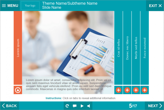 Lectora Templates help to create elearning courses faster and easier. Ready-made interactions allow you to focus more on e-course content than on the creation of a fully workable environment.