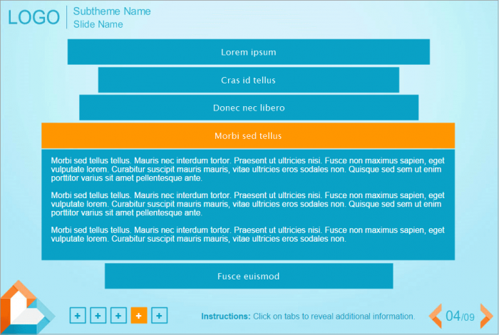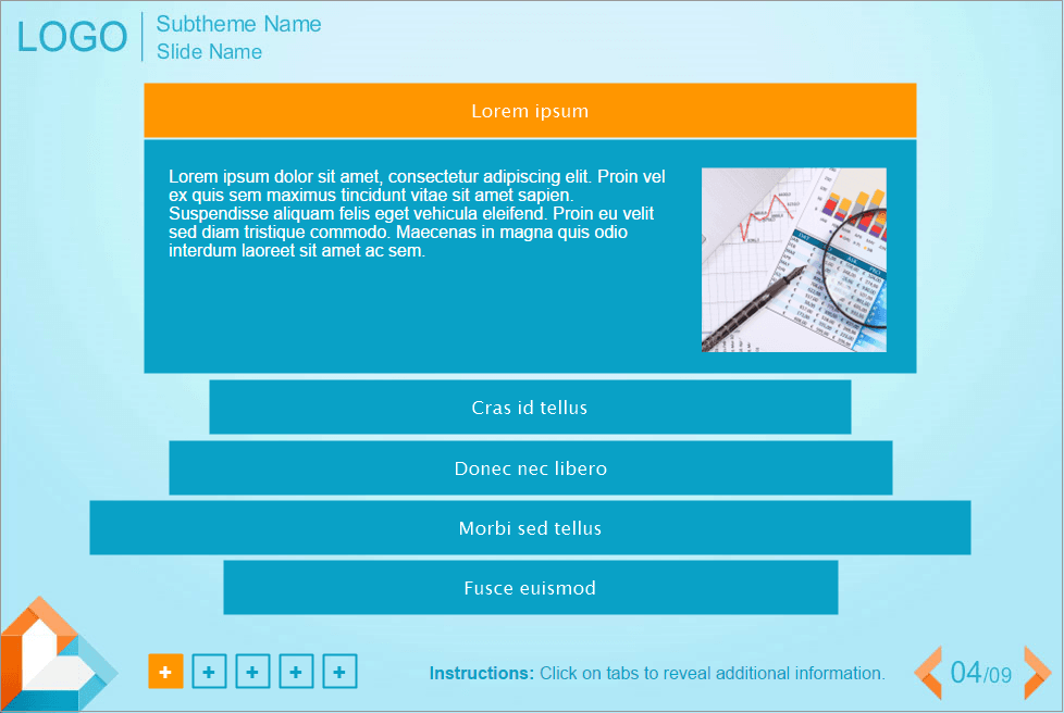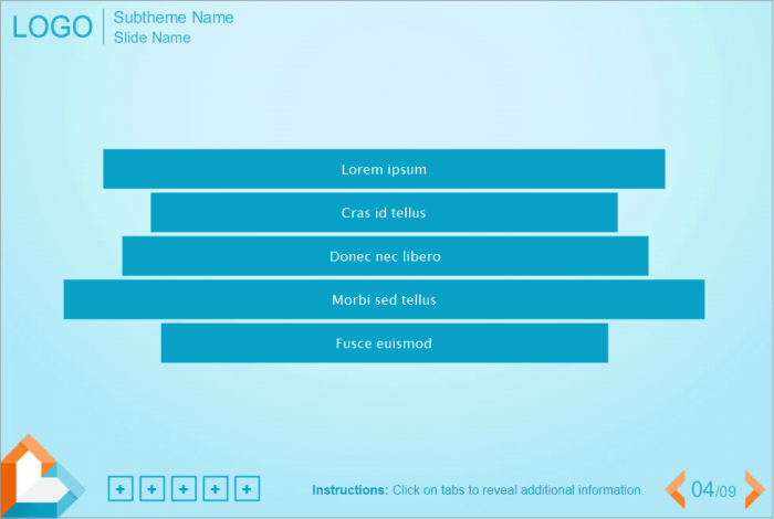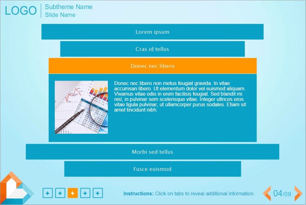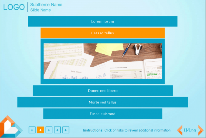 Lectora Vertical Accordion Template With Light-blue Fond. Developed with Lectora Publisher 16 software and compatible with any Lectora Publisher Player Skin. Lectora Template contains 5 horizontal blocks. Clicking on each of them leads to the showing an additional information. All blocks have different length. It can be used for creation of your own elearning courses. Perfectly runs on PCs, tablets and mobile devices. Accordion interaction is already prepared for usage.