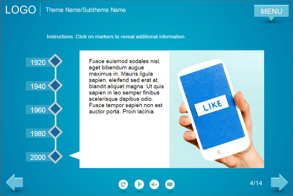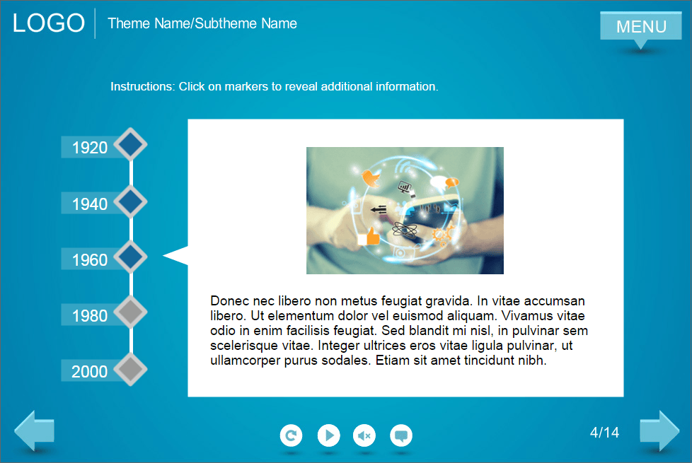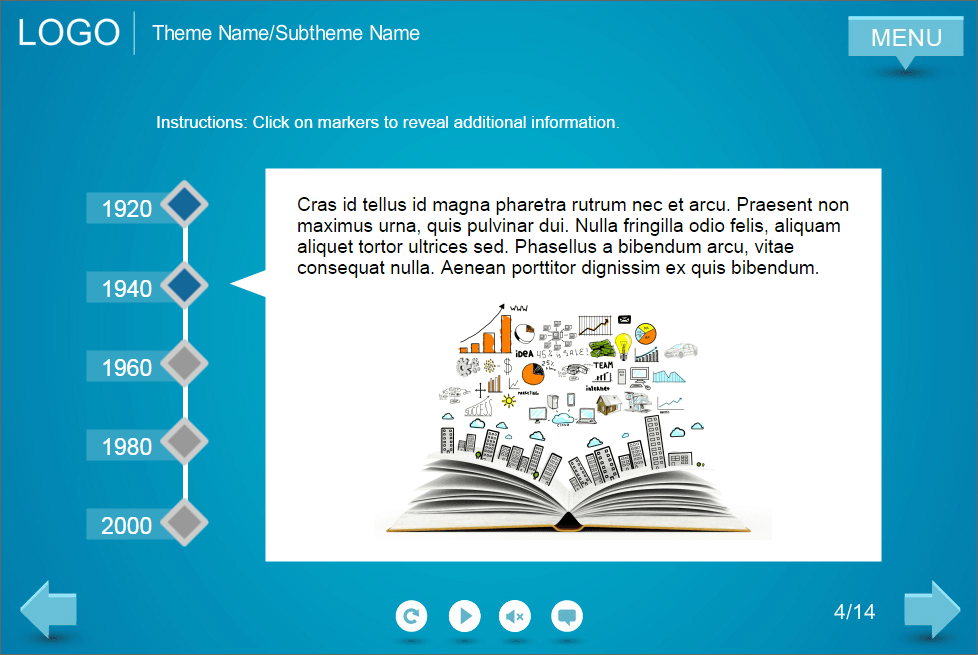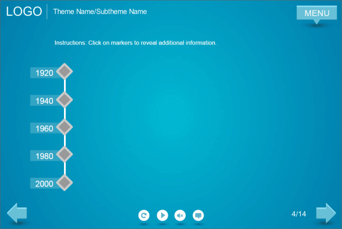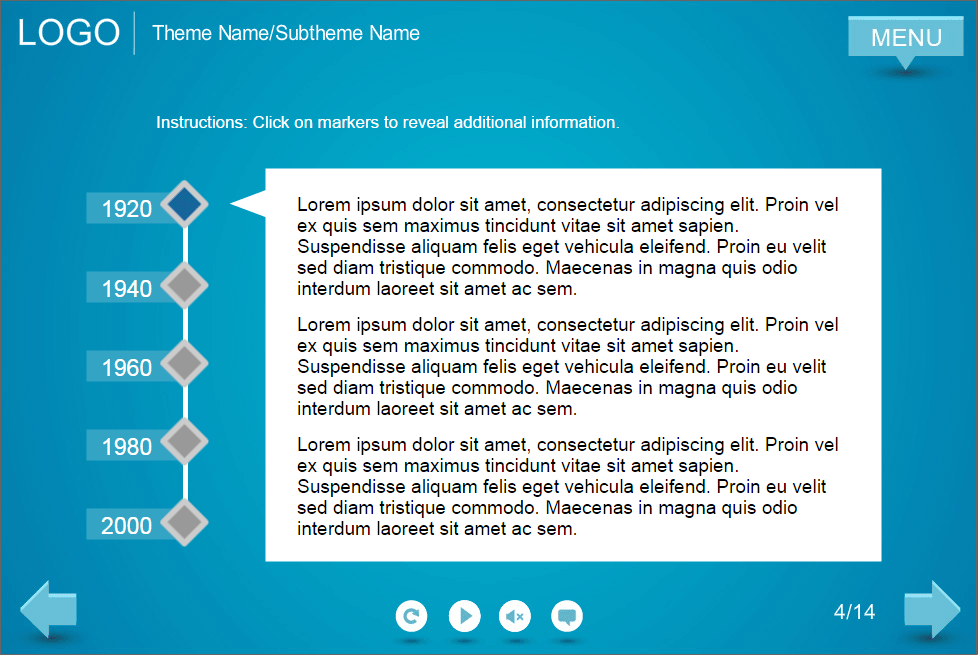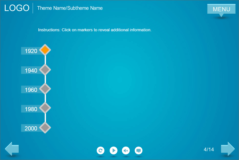 Lectora Rhombus Buttons Template. It consists of 5 clickable rhombus buttons with dates. Each of them contains additional information that displays in a central part of screen. Lectora Template is a ready-to-use product. It based on Lectora Publisher 16 software and compatible with any Lectora Publisher Course Player. Perfectly runs on PCs, tablets and mobile devices. It will be an excellent choice for your own elearning courses. Lectora Templates are easy to use: you just have to import your elearning content by copying and pasting or by using the drag-and-drop method.