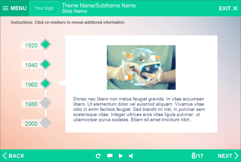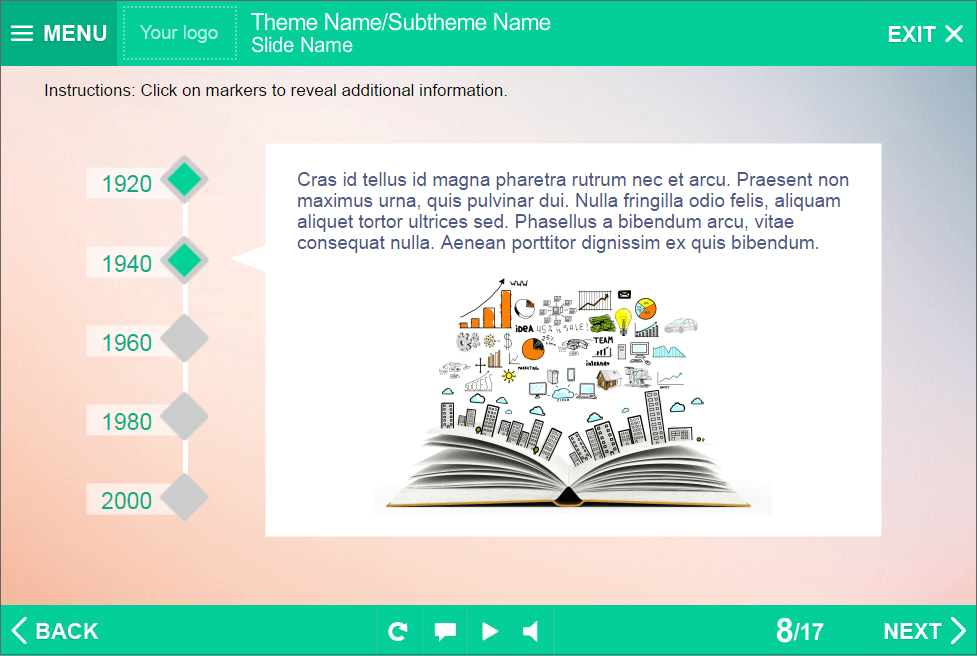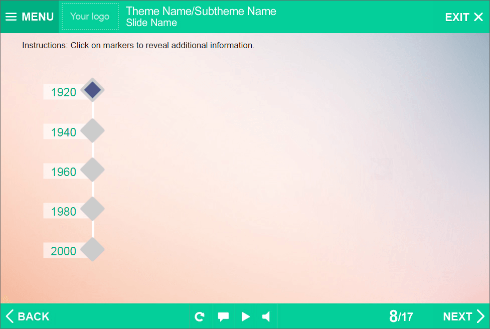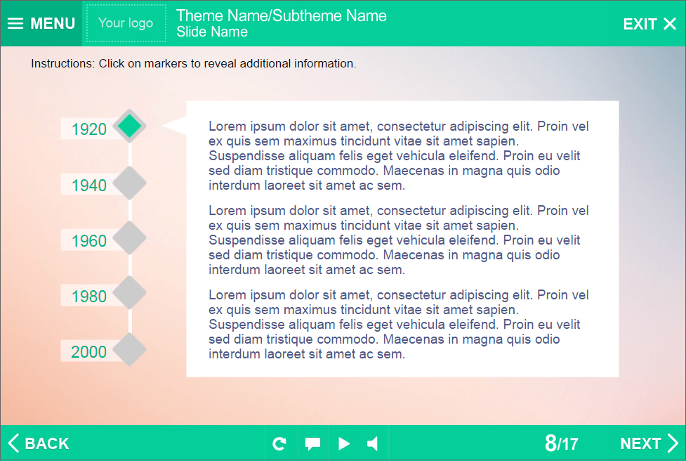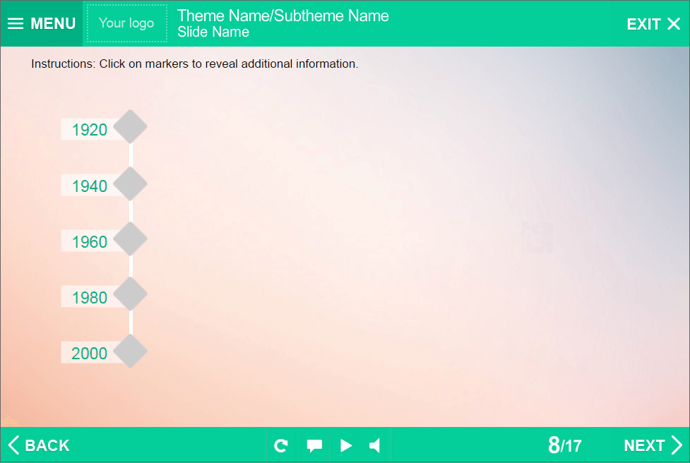 Lectora Vertical Timeline Template. It consists of 5 clickable rhombus buttons with dates. Each of them contains additional information that displays in a central part of screen. Lectora Template is a ready-to-use product. It based on Lectora Publisher 16 software and compatible with any Lectora Publisher Course Player. Perfectly runs on PCs, tablets and mobile devices. It will be an excellent choice for your own elearning courses. Lectora Templates are easy to use: you just have to import your elearning content by copying and pasting or by using the drag-and-drop method.