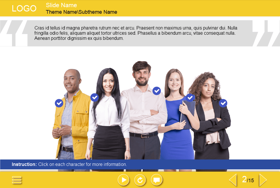 Five Characters — Lectora Template. An interactive quiz is based on Lectora Publisher 16 and is compatible with any type of lectora templates. There are five characters that present some course information. User must click each character to reveal the text and to figure the main idea out. The Lectora interaction is made to simplify the work of elearning developers and to provide better mastering of elearning material. It could be easily inserted in any elearning project. Lectora Templates are one of the most popular solutions among elearning developers. Extensive functionality allows to create powerful elearning courses.