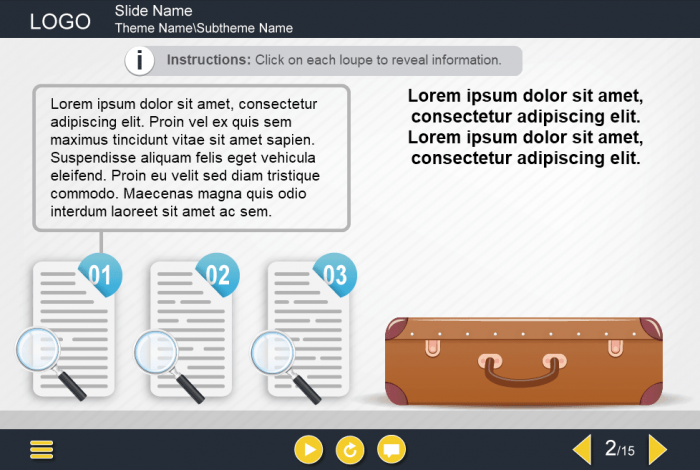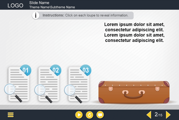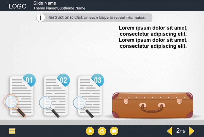 Lectora Reading Documents Template. It is an unique template based on Lectora Publisher 16 software. The template contains three clickable magnifiers placed over the papers. The user must click on each loupe to reveal the learning materials. This template would be an excellent choice to improve learner’s involvement in the educational process. Compatible with any type of Trivantis Lectora Course Player. The Lectora Template is a ready-made product that can be launched on both PC and tablet.