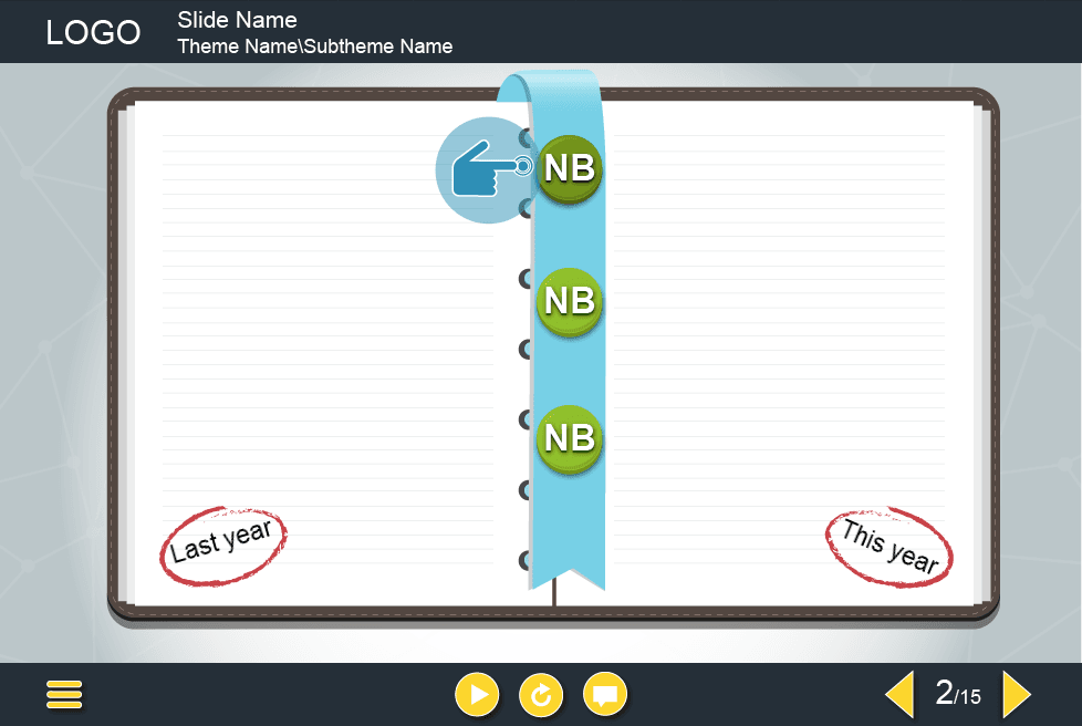 Lectora Notebook With Bookmark Template is a ready-to-use template based on Lectora Publisher 16 software. It contains three clickable buttons invented to reveal the learning materials. This template can be used to easily compare the course information represented on an interactive slide. It would be an excellent addition for your own elearning project. The interaction can be built into any lectora course player. Perfectly runs on both PC and tablet.