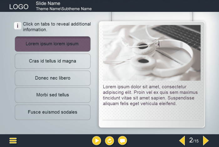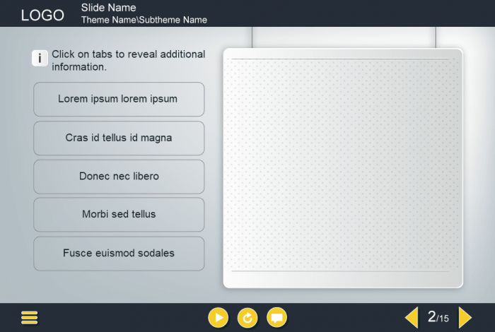 Lectora Five Vertical Tabs Template. It includes 5 clickable tabs invented to reveal the additional information. The Lectora Interaction is based on Lectora Publisher 16 software. It is a ready-to-use product, that is compatible with any Lectora Course Template you like. You’ll surely create an effective e-course with its help. Interaction perfectly runs on both tablet and PC.