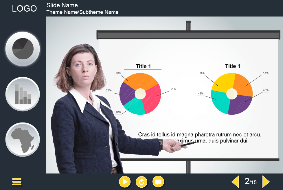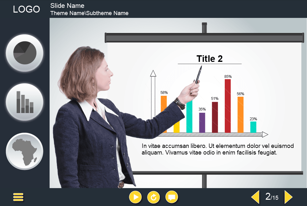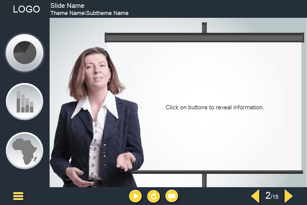 Lectora Female Business Coach Template is a ready-to-use elearning template based on Lectora Publisher 16 software. A handsome mid-aged woman dressed in formal suit holds a presentation while stands next to the flip chart. The user must click on the round buttons at the left part of the screen to reveal the course information. This well-designed Lectora template will surely help you to present the course information in a creative way. It perfectly runs on both PC and tablet.