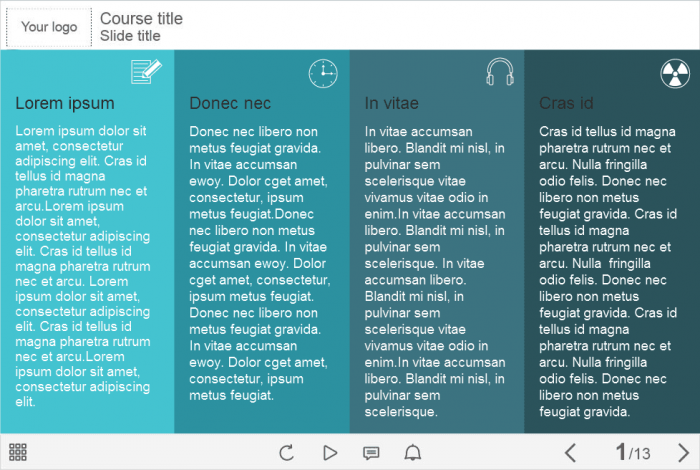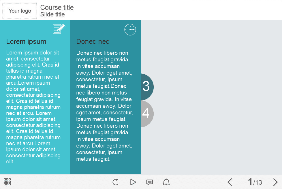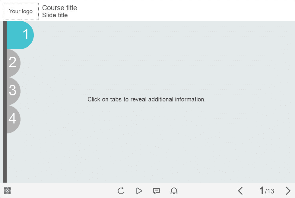 Lectora Retractable Tabs Template. Designed in light-gray and blue colors, this Lectora Template would be a perfect choice to present the course information in a creative way. It contains four clickable tabs designed in the form of numbered semi-circles. The user must click on all tabs sequentially to reveal the learning materials. The template is based on Lectora Publisher 16 software. It is possible to build it into any Lectora Course Template you need.