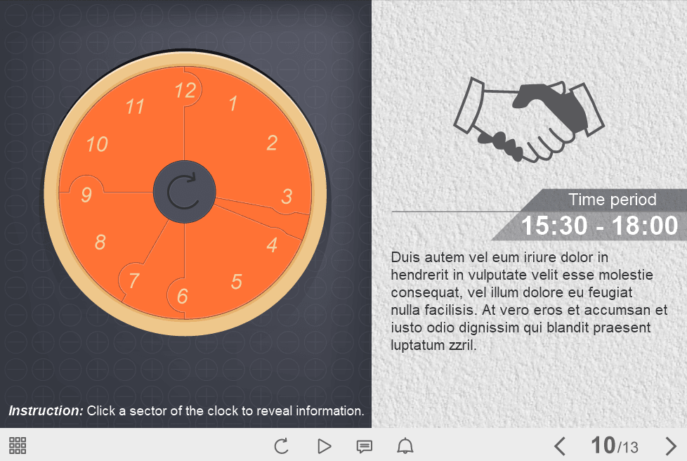 Lectora Segmented Watch Dial Template. A well-designed elearning template would be a great choice to present the course information in an easily perceivable form. It contains a clock face that is placed at the left part of the screen and is divided on 6 clickable segments. The user must click on each of them to reveal the learning materials.