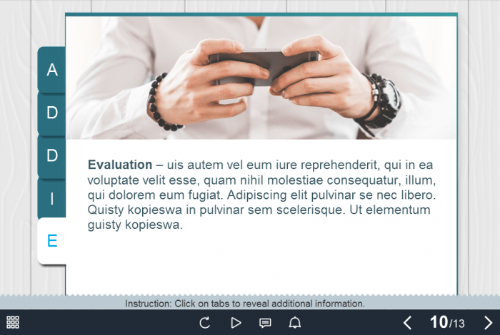 Lectora Tabbed ADDIE Model Template is a ready-to-use elearning template based on Lectora Publisher 16 software. It contains 5 clickable tabs invented to reveal the course information. This well-designed lectora template will surely help you to create a fascinating educational project for instructional designers and training developers. It perfectly runs on both PC and tablet.