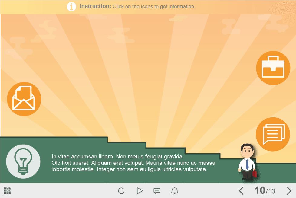 Lectora Climbing Stairs Template. Designed in variegated colors, this unique elearning interaction will surely help you to present the course information in a creative way. It contains 4 clickable buttons designed in the form of orange circles with simple icons. The user must click on them sequentially to reveal the learning materials. The Lectora Template would be a great choice to create a powerful training course.