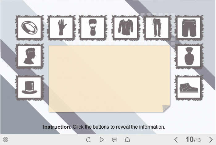 Lectora Men’s Wardrobe Template. An unique elearning interaction will surely help you to present the course information in a creative way. It contains 10 clickable objects designed in the form of squares with images of the men’s wardrobe elements. The user must click on each picture to reveal the course information on the same slide. The Lectora Template would be a great choice to create a powerful training course.