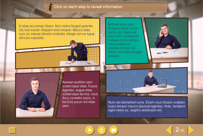 Lectora Flip Cards with Gadgets Template. Designed with Lectora Publisher 16 software. The interactive slide contains 4 clickable cards invented to reveal the learning materials. The cutout photos of a handsome male customer service representative are used to illustrate the template’s main character. It is already designed and prepared fot usage.