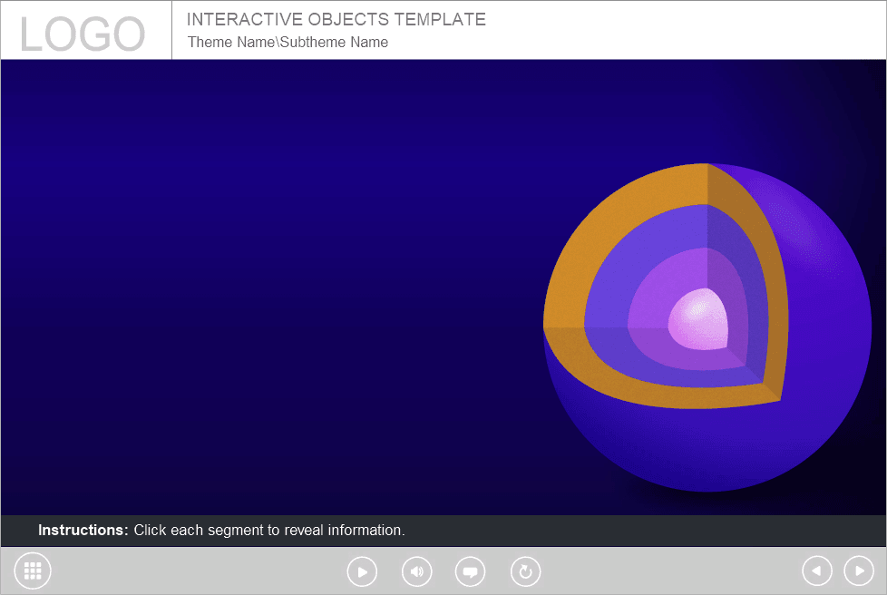 Lectora Clickable Sphere Layers Template. The unique lectora interaction is designed with Lectora Publisher 16 software. It contains 4 clickable items invented to reveal the course information. Designed in purple and yellow colours, this Lectora Template would be a great choice to increase learner’s attention in the training process. It’s a ready-to-use product that perfectly runs on both PC and mobile devices with screen size larger than 7 inches. We’ve collected a huge variety of Trivantis Lectora templates especially for eLearning developers. Now it will become even easier to create an electronic course “from scratch”.