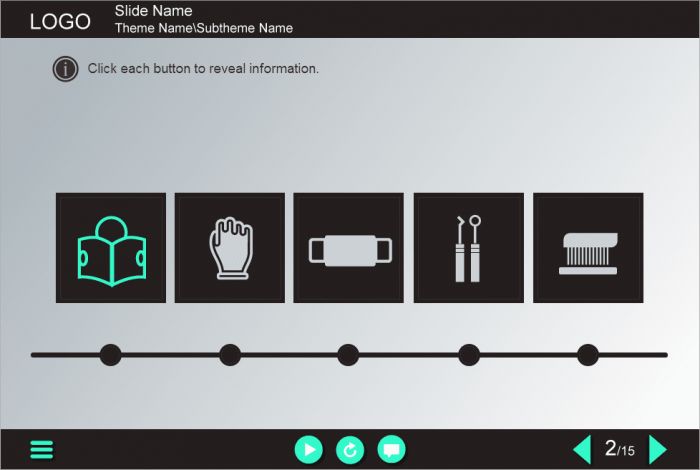 Five Tabs with Dentist`s Cutout Photos — Lectora Template. The unique lectora interaction is designed with Lectora Publisher 16 software. It contains 5 black square buttons with icons. The user must click on each button to reveal the course materials in pop-ups. Cutout photos of a handsome young doctor are used to to improve the perception of learning information. Designed in black and gray colours, this Lectora Template would be a great choice to increase learner’s attention in the training process. It’s a ready-to-use product that perfectly runs on both PC and mobile devices with screen size larger than 7 inches. We’ve collected a huge variety of Trivantis Lectora templates especially for eLearning developers. Now it will become even easier to create an electronic course “from scratch”.