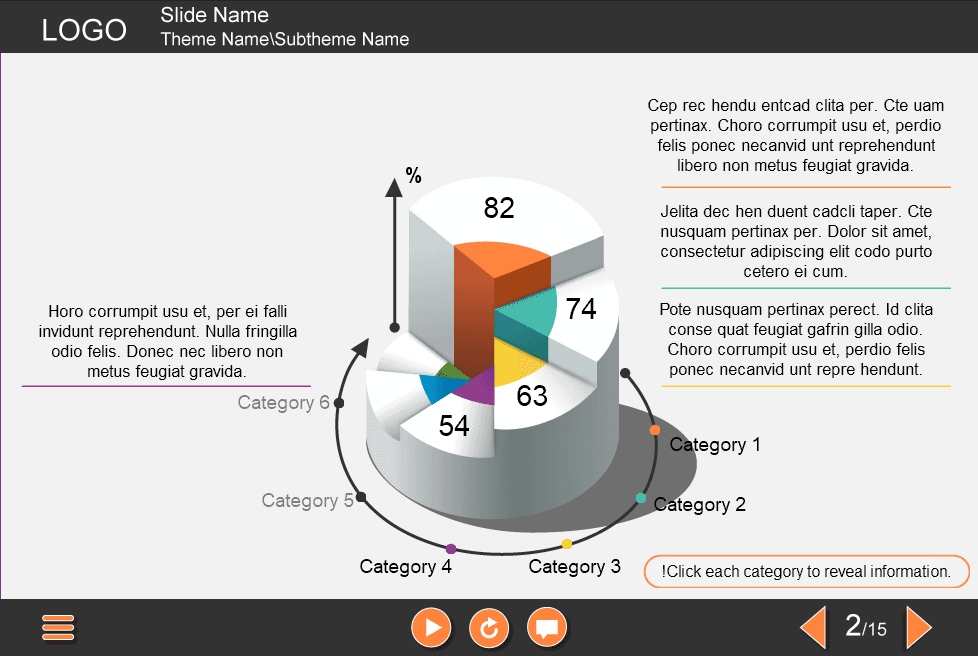 Round Cylinder Chart — Lectora Template. It contains 6 buttons which are located around the graph. The user must click on each button to reveal the additional information. This unique eLearning template is designed with Lectora Publisher 16 software. It is fully compatible with any Lectora Course Player.