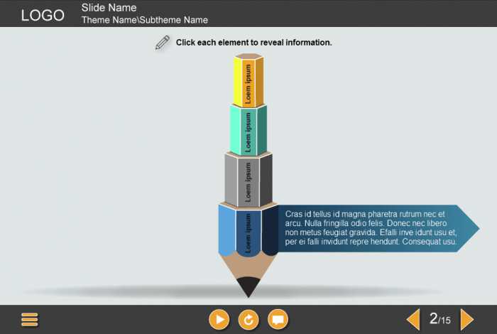 Interactive Pencil — Lectora Template. The unique lectora interaction is designed with Lectora Publisher 16 software. It contains the interactive pencil that is divided on 4 parts. The user must click on each part to reveal the learning materials.